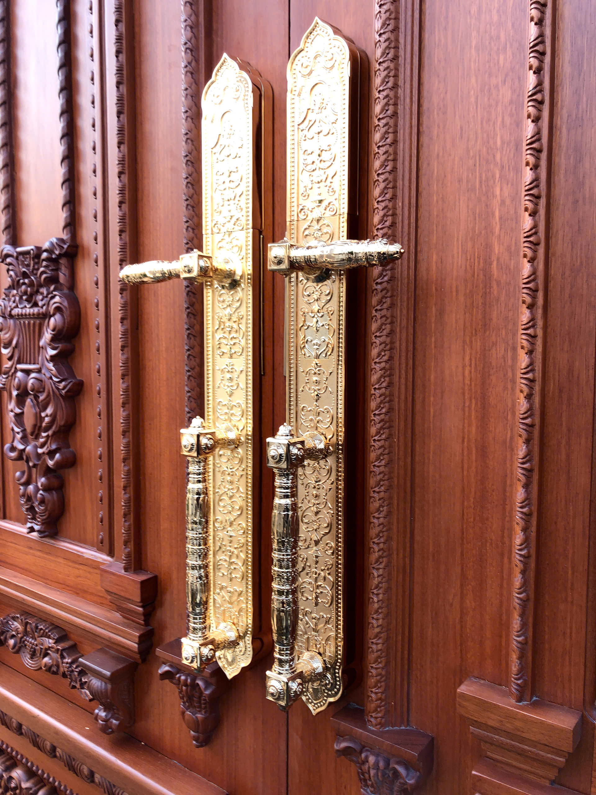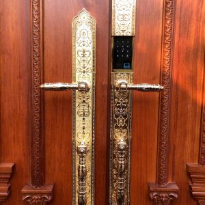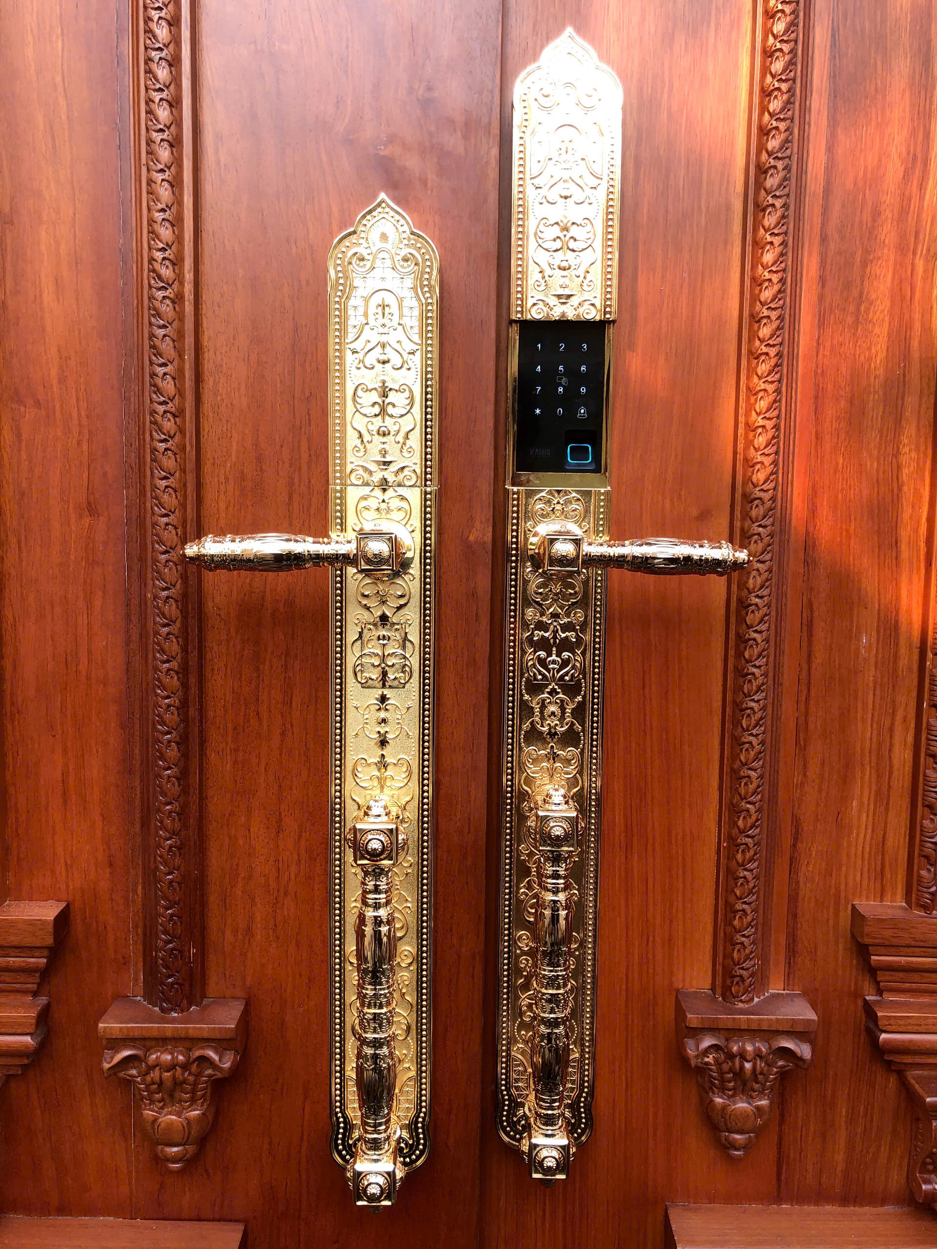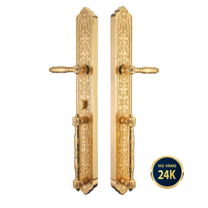- Chất liệu Đẳng Cấp: Toàn bộ thân khóa được đúc từ Hợp kim nguyên khối, với bề mặt được mạ màu Vàng 24K tinh xảo, thể hiện rõ nét phong cách quý tộc Châu Âu. Các chi tiết hoa văn chạm nổi, tay nắm uốn lượn được chế tác cực kỳ tỉ mỉ.